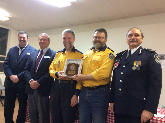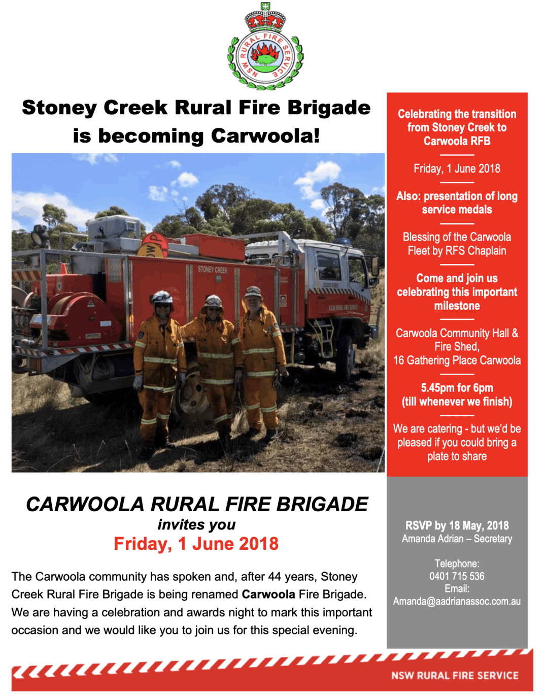 Once the decision was made, and approval from the RFS Lake George District Manager gained, attention turned to how we would mark the event. An invitation was sent out as widely as possible to all previous members of Stoney Creek. A ceremony/party was planned for 6pm, 1 June 2018 at the Stoney Creek Community Hall and a number of VIP guests were invited. Some long outstanding Long Service Medals were presented and our newly rebadged fleet was blessed by the local RFS Chaplain Ken King.