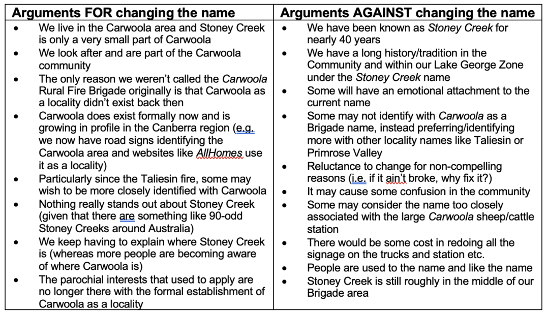 The issue was raised in a paper to all members and then discussed at a monthly meeting. The members were very conflicted as they liked both options and wanted to consult the local community. This was done via an article in the Stoney Creek Gazette and an online survey. On receiving the results of the survey, which came down heavily in favour of changing the name to Carwoola, the members also voted (narrowly) in favour of changing the name.